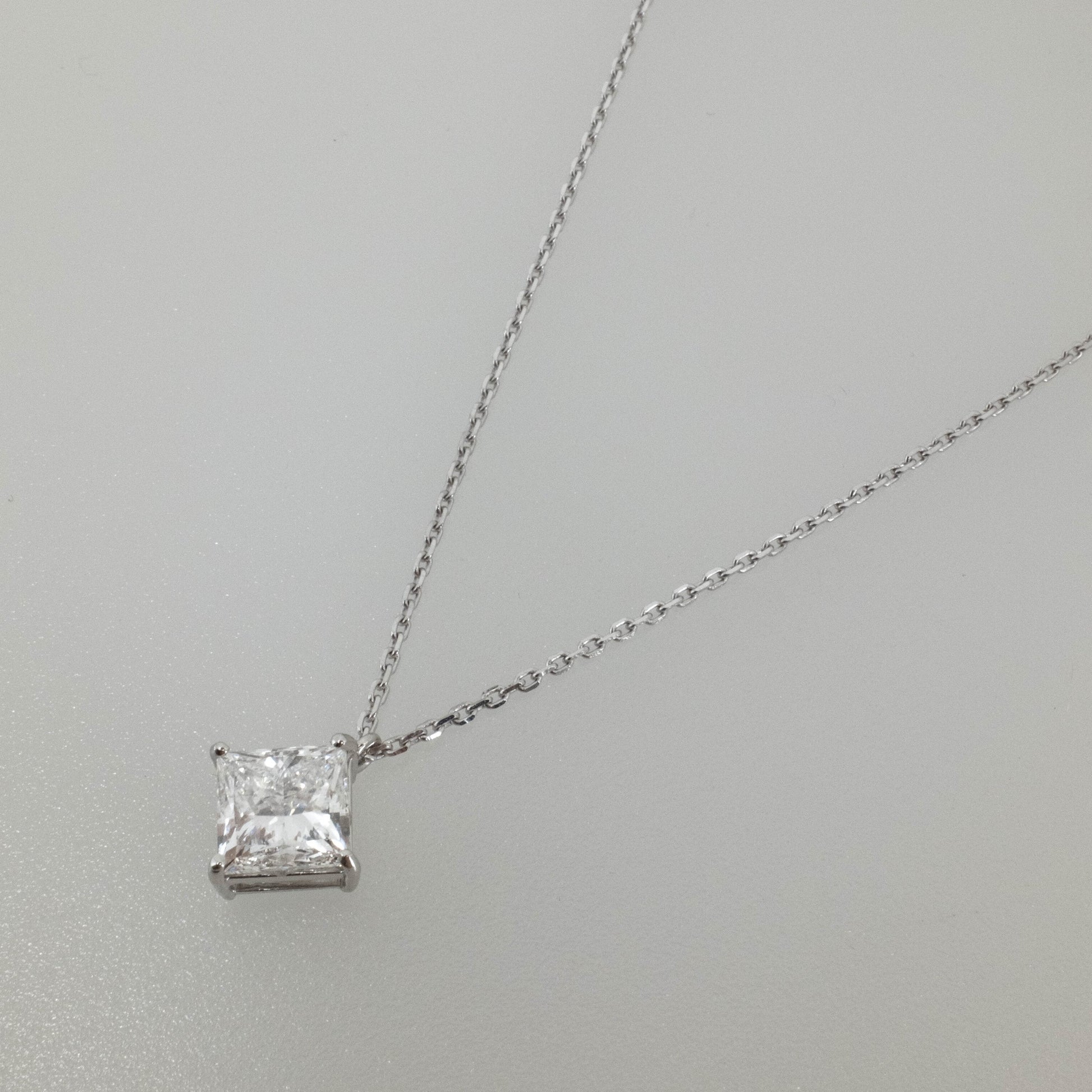 Bold brilliance meets modern elegance. This pendant features a 3.04-carat princess-cut lab-grown diamond, expertly faceted to reflect light with exceptional fire and symmetry. Set in 14K white gold and suspended on a fine chain, it embodies timeless sophistication and sustainable luxury.