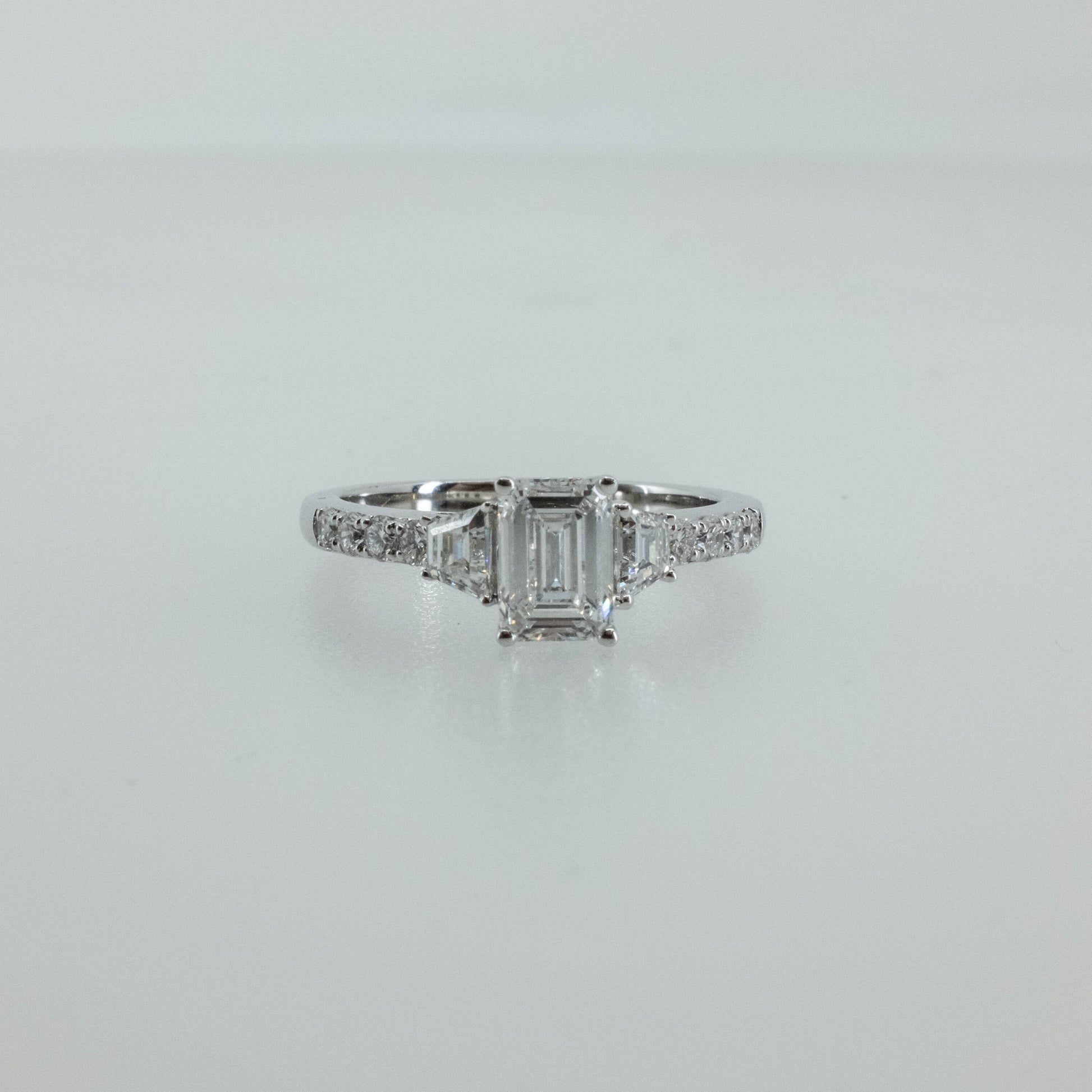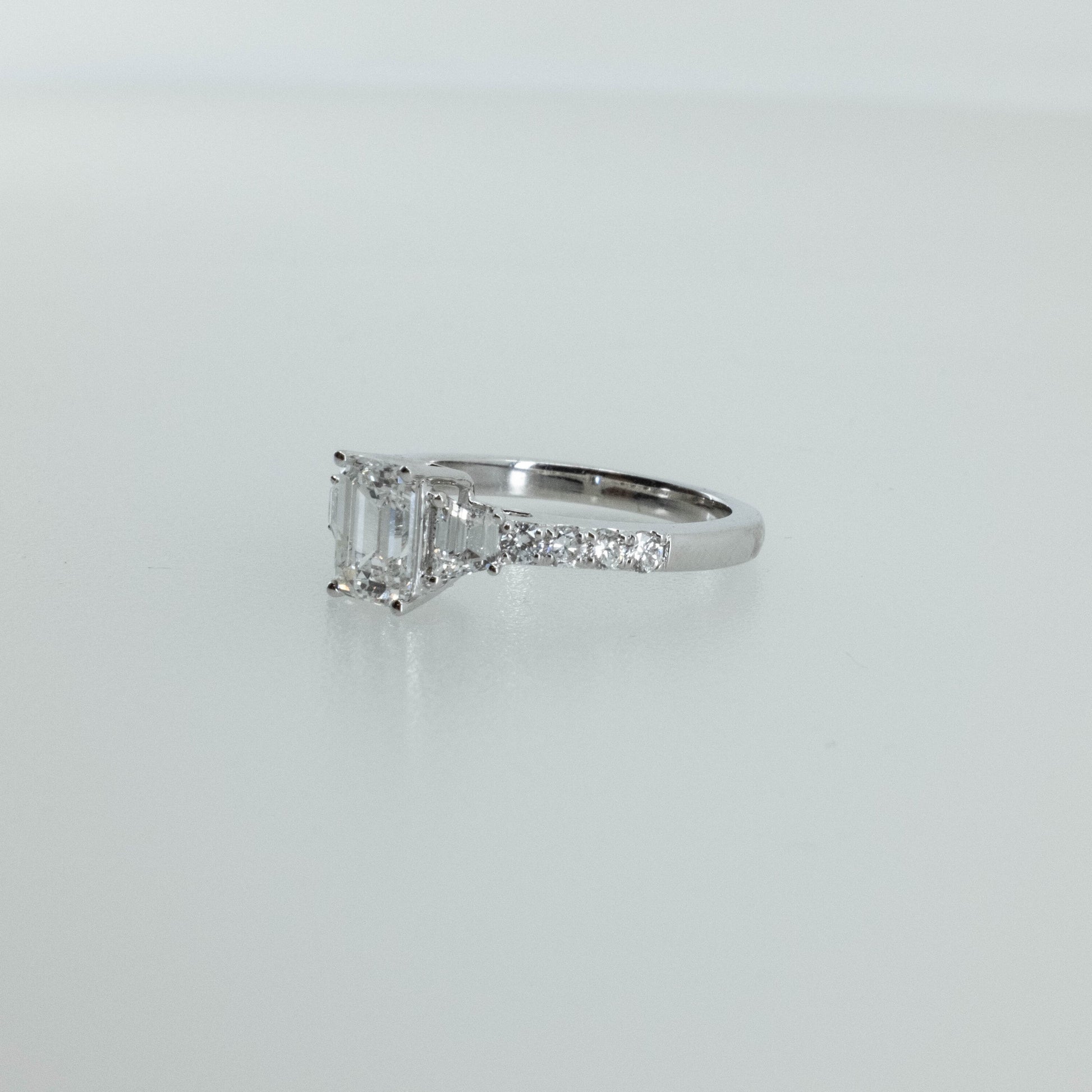 Elegant and refined, this 1.50ct emerald-cut lab-grown diamond ring features a striking center stone framed by shimmering accent diamonds along the band. The step-cut facets of the emerald diamond create a mesmerizing hall-of-mirrors effect, beautifully complemented by the subtle sparkle of the accent stones.