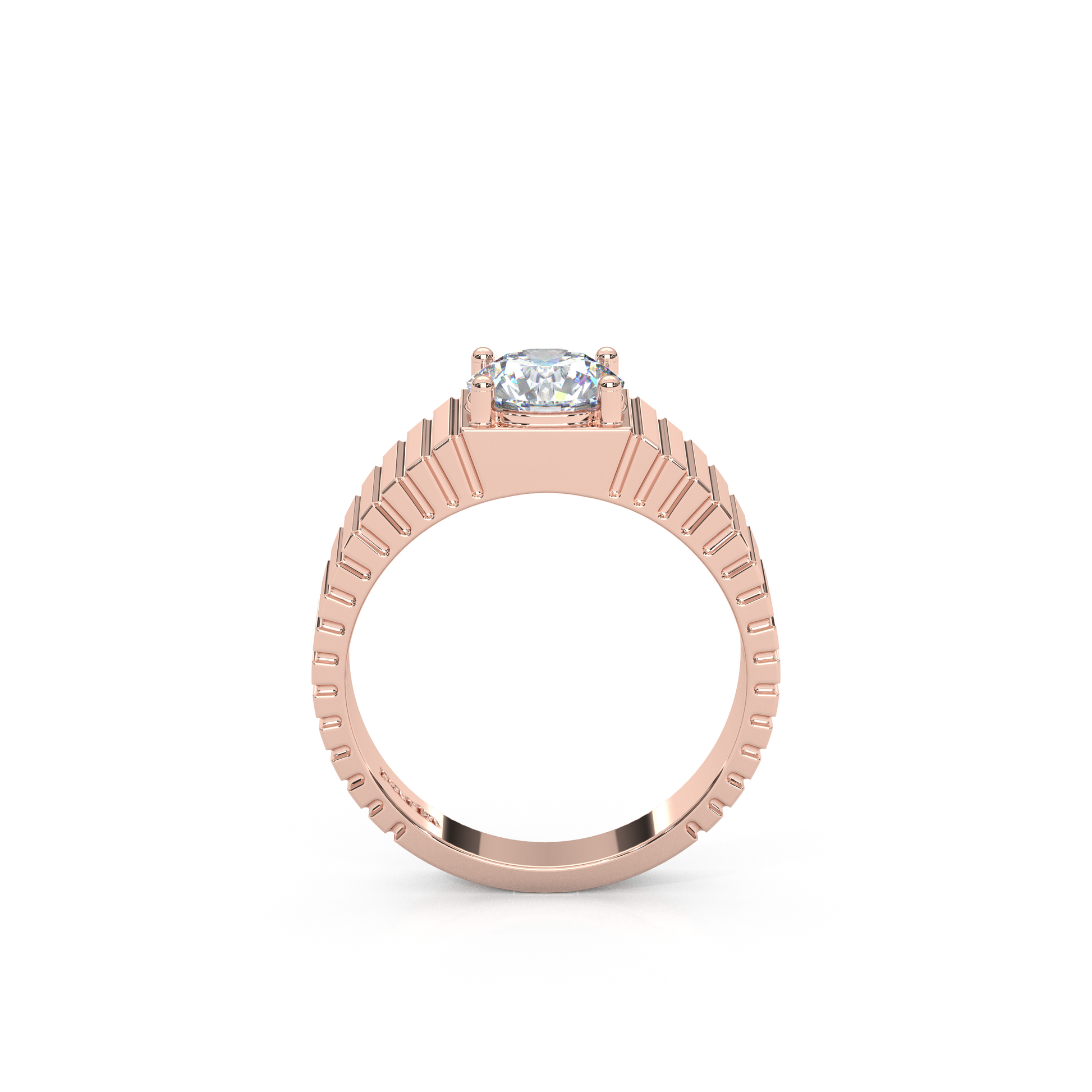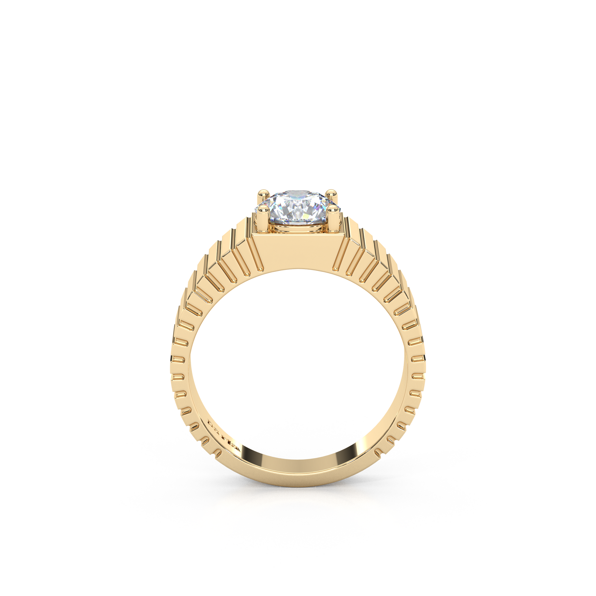 Redefining the classic solitaire. The Architect Band marries industrial texture with timeless brilliance. Designed for those who appreciate weight and presence, this ring features a substantial 7mm wide band detailed with precision-cut vertical ribbing that catches the light from every angle.